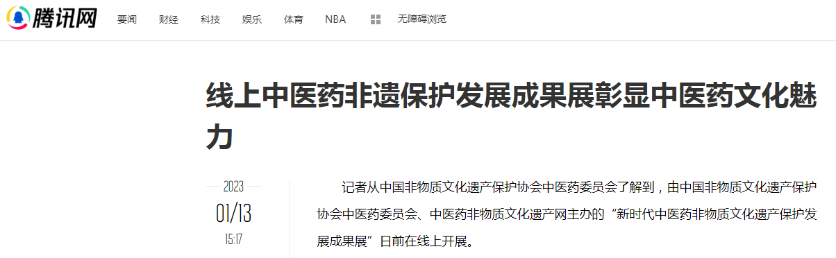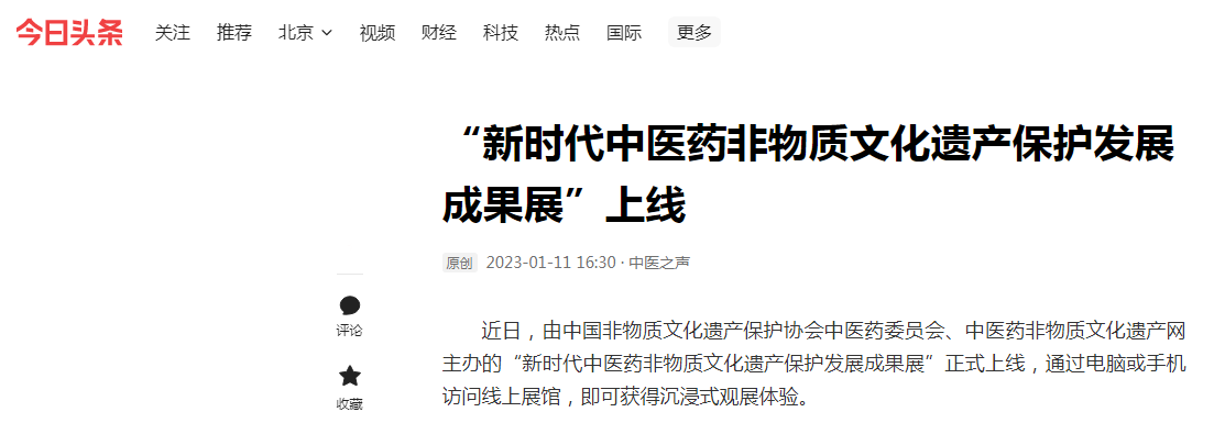 “新时代中医药非物质文化遗产保护发展成果展”自2023年1月11日上线以来,备受瞩目,得到社会各界广泛关注、高度评价,新闻媒体集中报道,截至2月14日24:00,浏览量达19.5万余人次。该展是传播中医药非物质文化遗产知识,服务民众健康的创新性探索;也是推进中医药非物质文化遗产传承保护,弘扬中医药防病治病正能量的生动实践;更是为走进新时代、迈向中医药非物质文化遗产事业新征程凝聚奋进力量的有效举措。